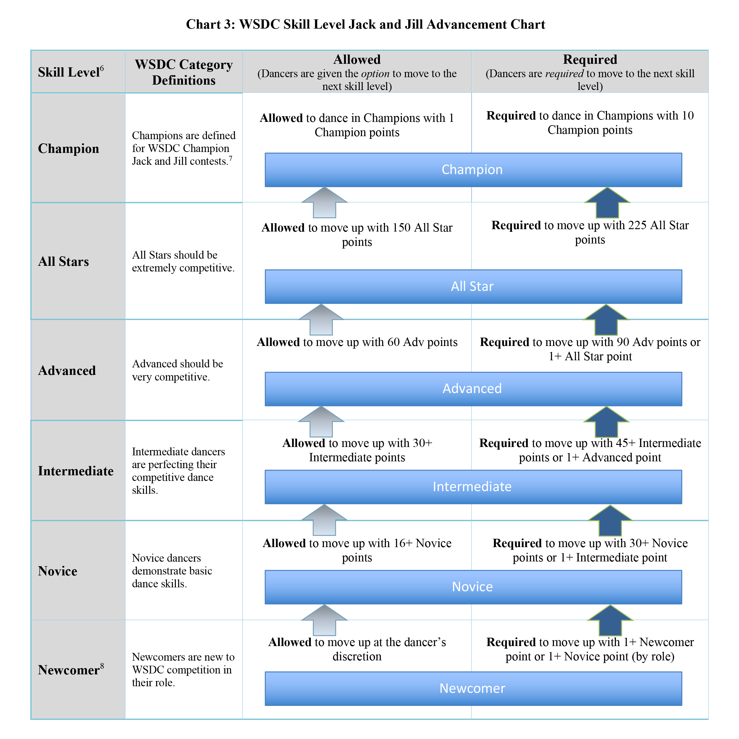 The World Swing Dance Council Points Registry is used to determine eligibility for the West Coast Swing Jack & Jill divisions. The only way you may enter a division other than by meeting the points qualifications below is by petitioning the chief judge or event director before the competition.