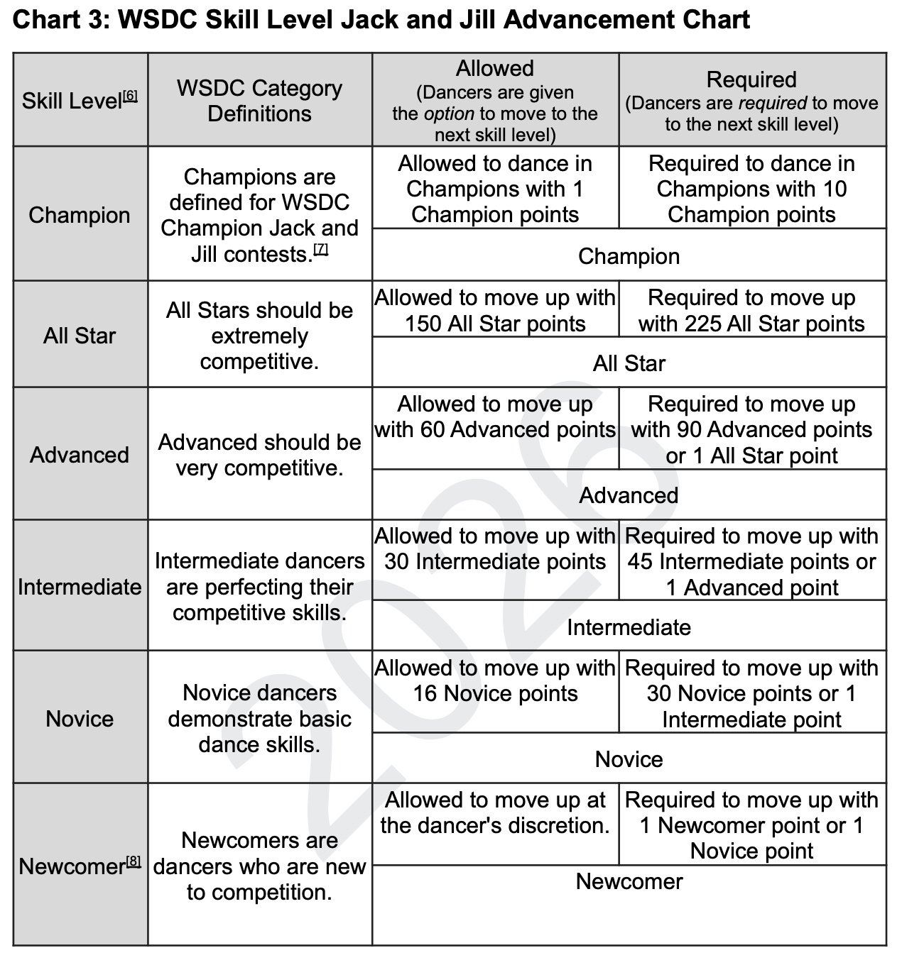 6 – The points required for moving up (or down) is based on the points in the dancer’s primary role, not the combined points in their primary and secondary roles.