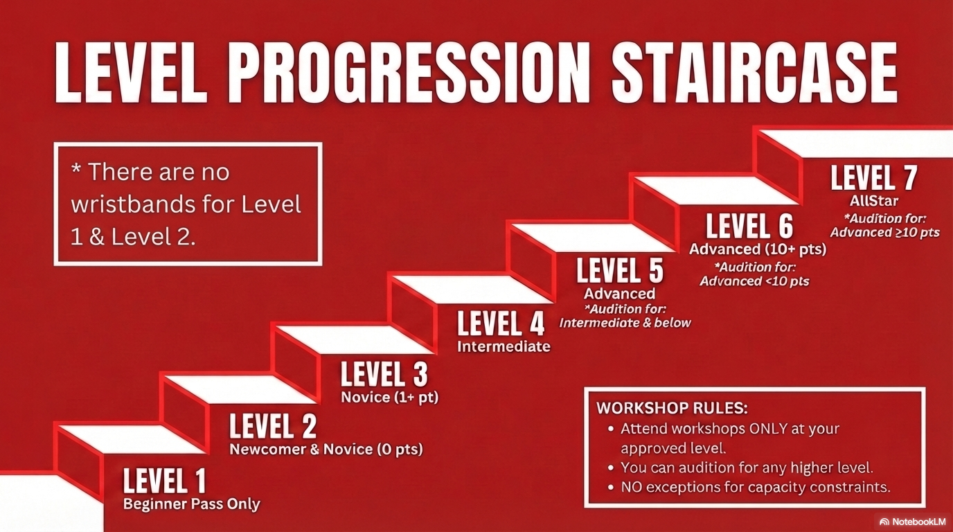 - Level 4: Intermediate Dancers (Newcomer & Novice dancers have to audition for this level)